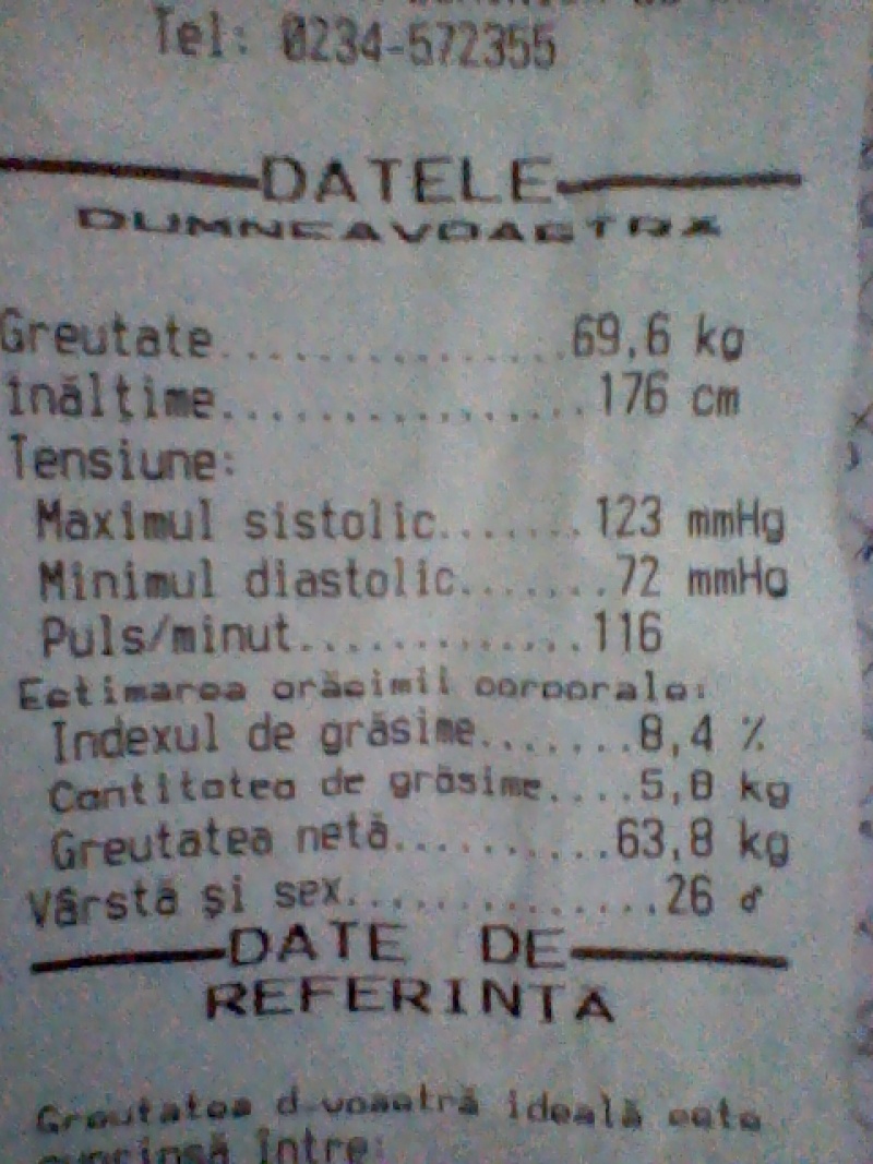 am fost astazi la farmacie sa fac un set complet de masuratori. rezultatul nu este rau deloc. grasime corporala doar 8,5% wow