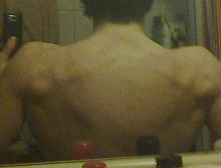 O poza cu spatele meu dupa 3-4 luni de sala, stiu ca se putea mult mai bine dar asta e..(Nu a fost facut din fata deci nu se vede prea bine latimea in partea stanga a mea iar partea dreapta nu era intinsa de tot pentru ca tineam telefonul)Eram incordat pentru a se vedea latimea.