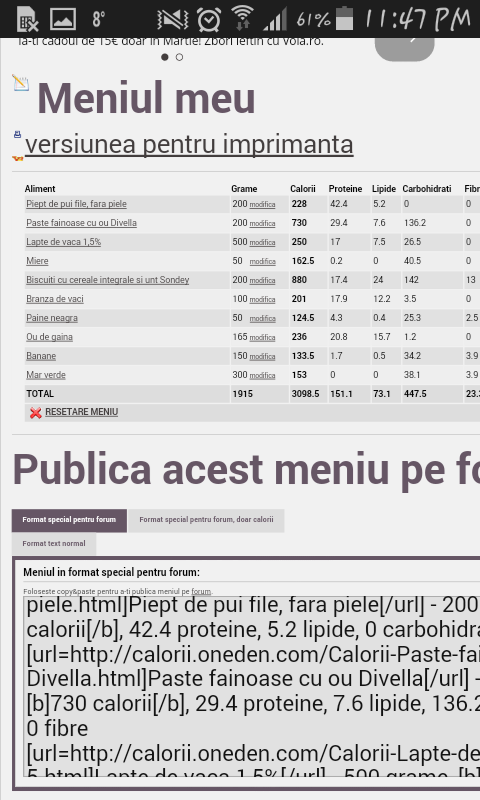 Mentionez ca am 17 ani, 1.74 aproximativ si 66kg, am sa pun si o poza cu tabelul nutritional din dieta si o poza de acum o luna de cand m-am reapucat cand aveam 64kg