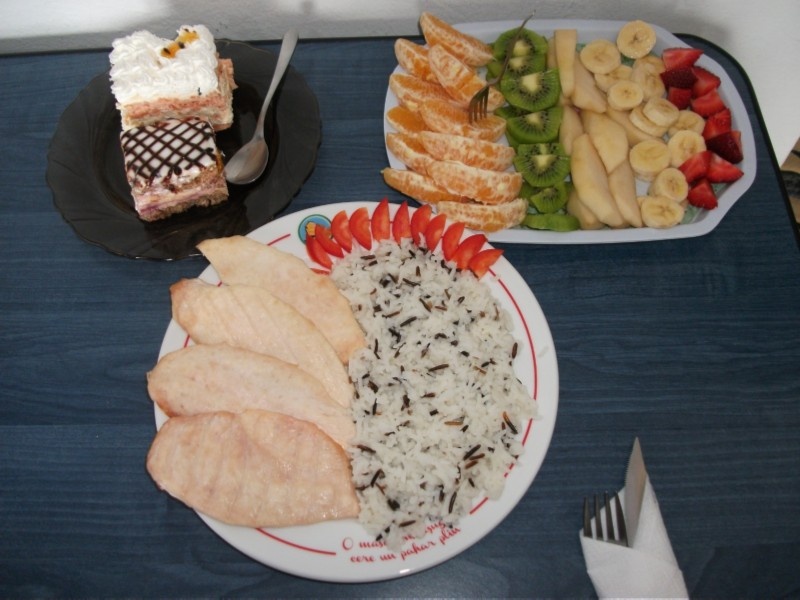 Dupa platoul de fructe am pus prajiturile inapoi in frigider si mai astept putin si ma apuc si de felul principal orez salbatic & basmati cu piept de pui si cativa ardei kapia taiati de decor