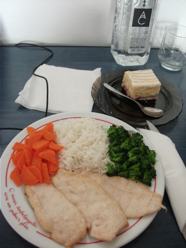 Ora 17. In momentul de fata servesc piept de pui(pregatit la abur) si un mix bazat pe salata verde, ridichi,porumb,ardei kapia,telina si morcov ras.