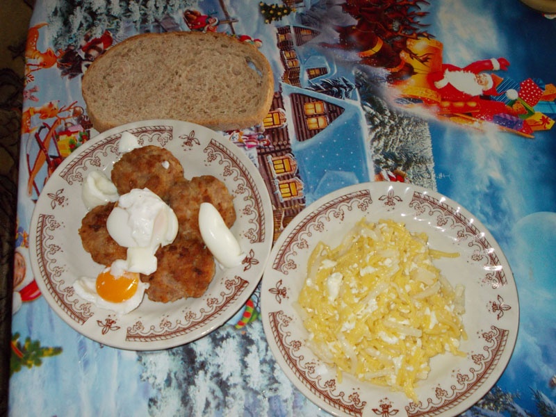 cartofi natur sau pireu cu 2-3 felii de branza si sunca de curcan cu o salata de varza