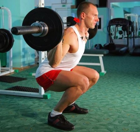 la executarea exercitiului "genoflexiuni cu haltera la ceafa" eu nu tin haltera pe trapez ci o tin pe gat(acolo unde am facut cu rosu in poza) din cauza ca nu ma lasa mainile, sa le mai dau in spate.