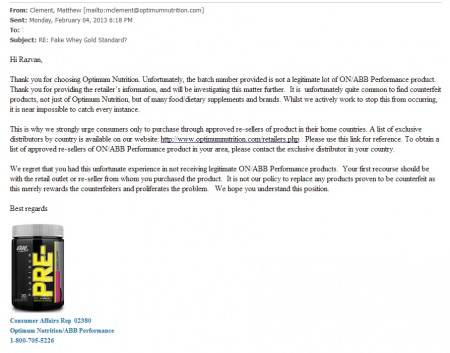 Salut! Vin sa intaresc afirmatiile celor "patiti" cu 100% Whey Gold Standard, cumparat de pe www.esuplimente.ro.Am cumparat si eu un borcan de 2,27 kg, pe care l-am ridicat personal de la acest individ. A tinut sa imi precizeze ca "Am si d'ala de SUA, e mult mai bun! Asta de Irlanda e varza." Am avut surpriza sa gasesc un sigiliu desfacut, un batch number imprimat pe fundul cutiei si o eticheta stearsa. Am contactat ON USA pentru a verifica lotul produsului, atasand si cateva poze cu acesta. Raspunsul celor de la ON a fost cel asteptat: lot inexistent, produs CONTRAFACUT. Atasat gasiti raspunsul celor de la customer service ON.
