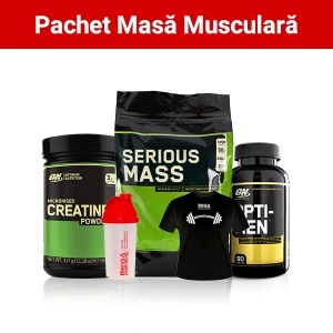Continut pachet: ON Serious Mass 5.4 kg Serious Mass a castigat in 2011, 2012, 2013 premiul pentru Gainerul Anului la concursurile prestigioase Supplement Awards, organizate de Bodybuilding.com. Gainerele sunt concentrate proteice care au in compozitia lor foarte multi carbohidrati. Acestea sunt recomandate persoanelor care doresc sa creasca in masa musculara si forta. Gainerele se consuma in cantitati mai mari decat proteinele si anume 200-300 g gainer/ zi. Acest lucru inseamna intre 50-60 g proteine si 160-250 g de carbohidrati/ zi. Gainerele nu trebuie sa inlocuiasca o masa, ci trebuie sa o suplimenteze. Daca concentratia de proteine din gainer este mare, inseamna ca acel produs este bun. ON Micronised Creatine Powder Flacon de 317 g (88 de portii) Cu o formula care se absoarbe rapid, creatina monohidrat are calitatea de a creste performantele fizice in timpul activitatilor de intensitate mare. Micronized Creatine Powder de la Optimum Nutrition are la baza creatina monohidrat, recunoscuta pentru puritate si eficienta. Pentru ca a fost micronizata, pudra se amesteca usor si nu se depune dupa ce a fost amestecata in lichid. ON Opti-Men 90 Tabs Opti-Men a castigat in 2012, 2013, ca si in alti ani, premiul pentru cel mai bun Supliment de Multivitamine la concursurile prestigioase Supplement Awards, organizate de Bodybuilding.com. Flacon cu 90 de tablete (30 de portii) Opti-Men este un supliment nutritiv cu vitamine si minerale esentiale, aminoacizi liberi, extracte de plante si enzime digestive. Este un sistem complet de nutrienti, oferind tot ce este mai bun pentru performanta masculina. Opti-Men creeaza o fundatie solida pentru sanatate, performanta si vitalitate. Contine 4 amestecuri performante: • amestec-amino – aminoacizi cheie in forma libera • amestec-fito – concentrate din fructe si legume bogate in antioxidanti, pentru combaterea radicalilor liberi • amestec-enzi – enzime care ajuta la digestia si absorbtia nutrientilor • amestec-opti – un complex de 25 de vitamine si minerale, cu un accent pus pe antioxidanti si vitaminele din complexul B PROGRAM DE ANTRENAMENT PENTRU CRESTERE IN MASA MUSCULARA Acest program este dedicat pesoanelor care vor sa creasca in masa musculara. Pentru unii oameni sa castige greutate poate sa fie la fel de dificil cum este pentru pentru altii sa slabeasca. Fiind diferiti, unora le e mai greu sa creasca in masa musculara si forta decat altora. Ectomorful este un om slab, cu oase subtiri, masa musculara si strat de grasime reduse. Pentru un ectomorf este foarte greu sa ia in greutate, sa-si dezvolte masa musculara si sa castige forta. MegaProteine a alcatuit un program special creat pentru astfel de persoane. Luni * Piept * Impins cu bara pe orizontal (4x 6-8 rep.) * Impins cu bara pe inclinat (4x6-8 rep.) * Fluturari cu gantere pe orizontal (4x10 rep.) * Triceps -flotari intre paralele (4x maxim) * Impins frantuzesc cu bara ez (4x6-8 rep.) * Extensii la scripete (4x6-8 rep.) Marti * Dorsali * Traciuni cu priza larga (4x10 rep.) * Ramat la aparat (4x 8 rep.) * Indreptari cu bara (4x 8 rep.) * Biceps * Flexii cu bara din picioare (4x 10 rep.) * Flexii cu bara la banca scott (4x8 rep.) * Flexii alternative cu gantere (4x 8 rep.) Miercuri - pauza Joi * Coapse * Extensia picioarelor (4x10 rep.) * Flexia picioarelor pt. bicepsul femural (4x10 rep.) * Genuflexiuni cu bara (4x 8 rep.) * Gambe * Ridicari pe varfuri la aparat (5x20 rep.) * Abdomen * Crunch (4 x 30 rep.) * Ridicari de picioare din culcat dorsal (4x 12-20 rep.) Vineri * Umeri * Impins cu bara (4x8 rep.) * Ridicari laterale cu gantere (4x12 rep.) * Ramat cu bara vertical (4x 12 rep.) * Trapez * Ridicari de umeri cu bara (4x12 rep.) Prof. Antrenor - Borza Calin Compozitia nutritivaAfiseaza compozitia nutritivaMod de administrare Pachet pentru masa muscularaPortia de Serious Mass este formata din 2 cupe. Din portia de 2 cupe, 1 cupa se administreaza dupa antrenament si 1 cupa seara, inainte de culcare. Se amesteca 1 cupa mare (165 g) de Serious Mass cu 400 ml apa sau lapte.Portia de Creatine Powder este de 3.6 g, formata din 1 cupa. Se amesteca 1 cupa cu 240 ml de apa rece pana cand se dizolva. Se administreaza inainte de antrenament. Portia de Opti-Men este de 3 tablete. Se administreaza 3 tablete pe zi, alaturi de mese. PROGRAM DE ALIMENTATIE Ora 8:00 * 200 g fulgi de ovaz sau 200 g orez * omleta din 2 galbenusuri + 6 albusuri * 50 g branza slaba * un fruct la alegere * 2 tablete multivitamine + multiminerale Ora 11:00 * o portie de ON Serious Mass mixata in 400 g lapte Ora 13:00 * 200 g carne de pui sau vita la gratar * 200 g cartofi copti sau orez fiert * legume proaspete crude Ora 16:00 * o gustare + 5 g de creatina cu un fresh de portocale Ora 18-19 * antrenament Ora 19:00 * o portie de ON Serious Mass Gainer cu 400 ml lapte Ora 20:30 * 200 g piept de pui sau 200 g peste * 200 g paste din grau dur sau cartofi copt APA - 2-3 litri zilnic