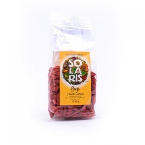 Saculet de 90 gFructele de goji sunt cunoscute de mii de ani si folosite in medicina chineza si cea tibetana, avand un continut mare de vitamine si minerale. Fructele de goji au un continut bogat in aminoacizi, minerale, vitaminele C, E, B, acizi grasi nesaturati. Cresc vitalitatea, alunga senzatia de oboseala, cresc rezistenta organismului. Fructele de goji sunt folosite la tratarea alergiilor. Imbunatatesc vederea si calitatea somnului. Tara de origine: China Compozitia nutritivaAfiseaza compozitia nutritivaMod de administrare Solaris Goji Fructe UscateFructele de goji se pot consuma ca atare (cca. 10-30 g pe zi) sau ca adaos in: iaurt, ceai, in amestec cu cereale, adaos la supe, ciorbe, salate, sosuri si multe alte feluri de mancare.